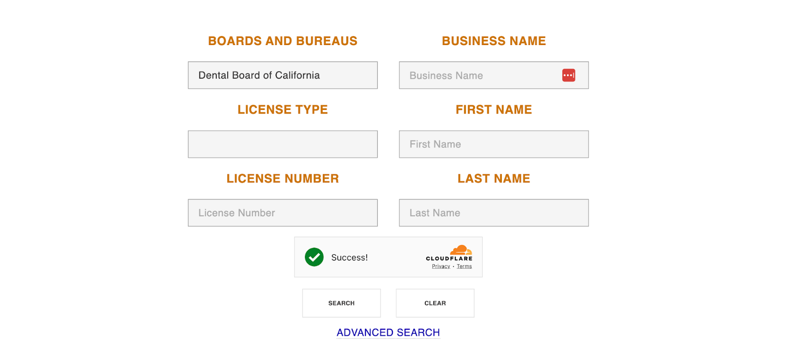 - 3. In Advanced Search, select the correct Board or Bureau (Dental Board of California for dentists and dentist permits).